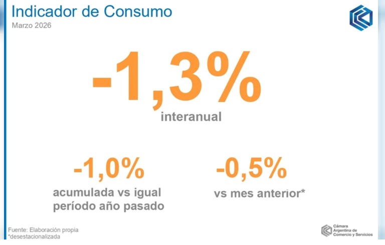 El Indicador de Consumo (IC) de la Cámara Argentina de Comercio y Servicios (CAC) registró en marzo una caída interanual del -1,3%, por debajo de la merma registrada en febrero, que había sido del -3,4%, de acuerdo con la evaluación del INDEC.